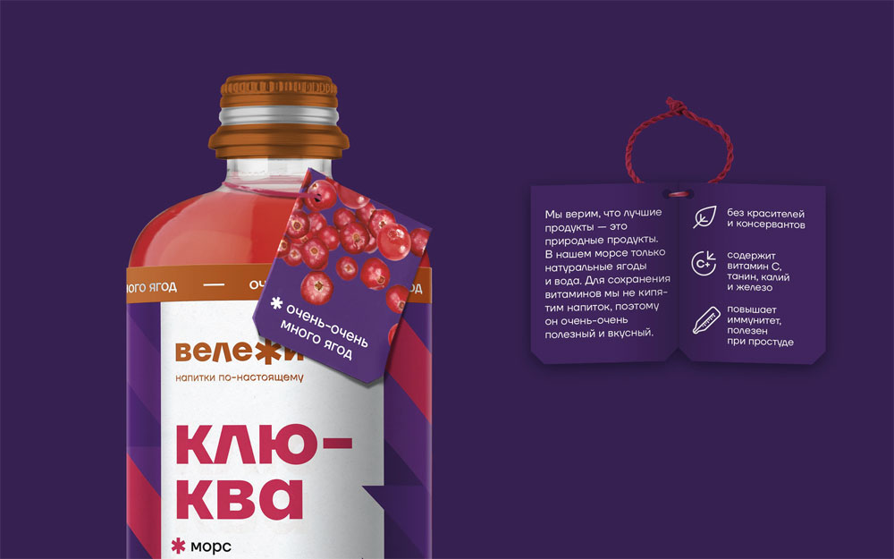 «Вележи» — звучный и слегка загадочный неологизм, берёт свои корни из языка древних тюрков — коренного народа Алтая. По легенде, похожим образом они называли поляны, лесные опушки, где собирали ягоды и травы. Легендарную часть коммуникации поддерживают более простые эмоциональные слоганы и дескрипторы. «Напитки по-настоящему» позиционирует продукт как абсолютно натуральный, а брендлайн с двойным наречием «очень» подчёркивает их превосходное качество.