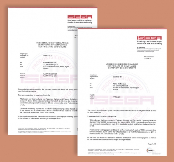 Получение сертификатов означает ISEGA, что мелованный картон KAMA Bright GC1, KAMA STRONG GS2 и немелованный картон KAMA UC1 соответствует европейским нормам и требованиям законодательства в области безопасности пищевых продуктов и может вступать в контакт с пищевыми продуктами.