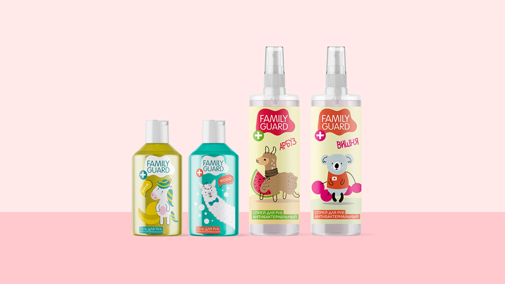 В упаковке для антисептиков Family Guard дизайнеры выбрали путь создания кастомизированных иллюстраций, привлекающих внимание основных потребителей продукции — семей с детьми.