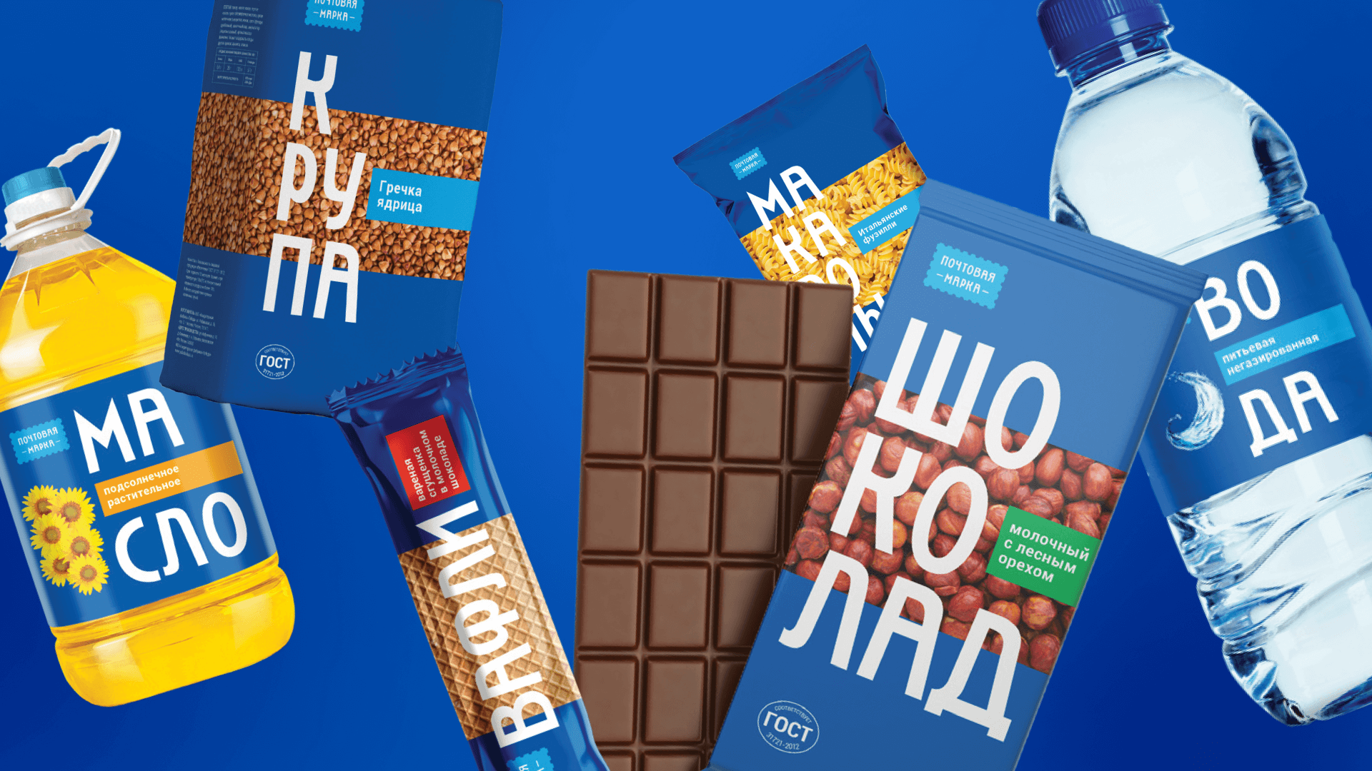 Логотип нового бренда напоминает почтовую марку: обыгрывается двойное значение слова – марка как привычный почтовый элемент и как название торгового знака. Для фона упаковки специалисты выбрали фирменный синий цвет Почты. Акцент дизайна сделан на изображение продукта или его главного ингредиента и крупную типографику. Дизайн-решение разработала маркетинг-команда Почты.