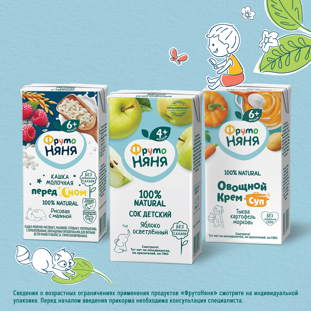 Временный обновленный лаконичный дизайн позволит продолжить бесперебойное производство соков и напитков, молочных продуктов, а также супов под брендом «ФрутоНяня» в упаковке Tetra Pak.