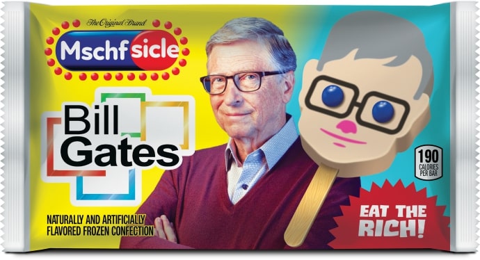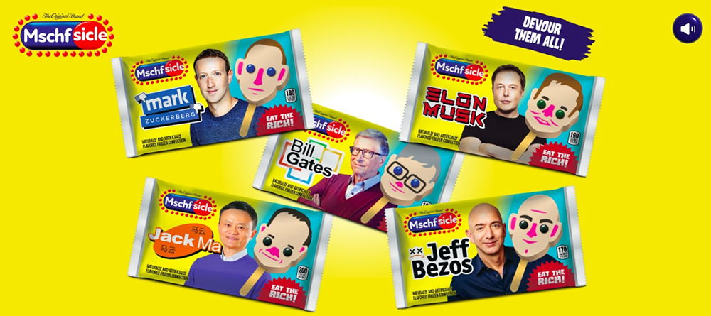 На фирменном фургоне, с которого продается мороженое Eat the Rich, улыбается маскот игры “Монополия” богатый дядюшка Толстосум. Кроме того, фургон пестрит надписями: “Snack on Jack” (закуси Джеком), “Suck on Zuck” (соси Цука), “Munch Musk” (жуй Маска), “Gobble Gates” (съешь Гейтса) и “Bite Bezos” (укуси Безоса).