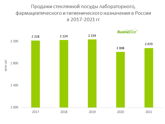 В 2020 г в условиях пандемии коронавируса продажи стеклянной посуды лабораторного, фармацевтического и гигиенического назначения в России сократились на 10,2% относительно 2019 г и составили 2,01 млрд шт. Медучреждения и медицинские лаборатории были вынуждены нарастить закупки медицинских изделий, диагностических реагентов и лекарств, необходимых для профилактики и лечения коронавируса. Закупки «несрочных» изделий были отложены на более благоприятное время. В результате, закупки для профилактических и исследовательских целей уменьшились. В 2021 г в России было реализовано 2,09 млрд шт стеклянной лабораторной посуды.
