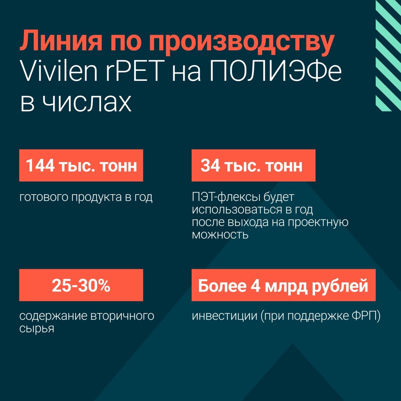 После выхода на проектную мощность «ПОЛИЭФ» сможет ежегодно выпускать до 144 000 тонн уже содержащей долю вторичного сырья ПЭТ-гранулы Vivilen. Объем повторно вовлекаемого полимера при этом составит до 34 000 тонн, что сравнимо с 1,7 млрд использованных пластиковых бутылок. Для запуска этого производства СИБУРу потребовалось интегрировать линию подачи вторичного сырья в уже существовавшую на башкирском предприятии технологическую цепочку производства первичного ПЭТ. При этом общая мощность ПОЛИЭФ по выпуску ПЭТ составит 252 000 тонн в год.