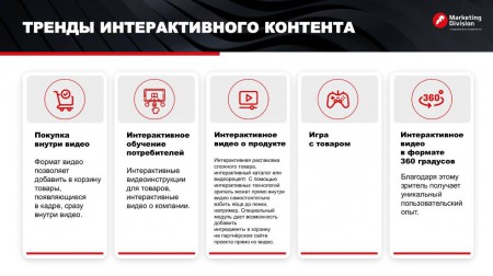 Тренды интерактивного контента охватывают: покупку внутри видео (формат видео позволяет пользователю добавлять в корзину понравившийся увиденный товар непосредственно из видео); интерактивное обучение пользователей (интерактивные видеоинструкции); интерактивное видео о продукте (интерактивное видео о продукте, интерактивная распаковка сложного товара, интерактивный каталог или видеорецепт и пр.); игру с товаром (в русле тенденции геймификации – взаимодействия бизнеса и клиента с помощью игр в режиме онлайн); интерактивное видео в формате 360 градусов.