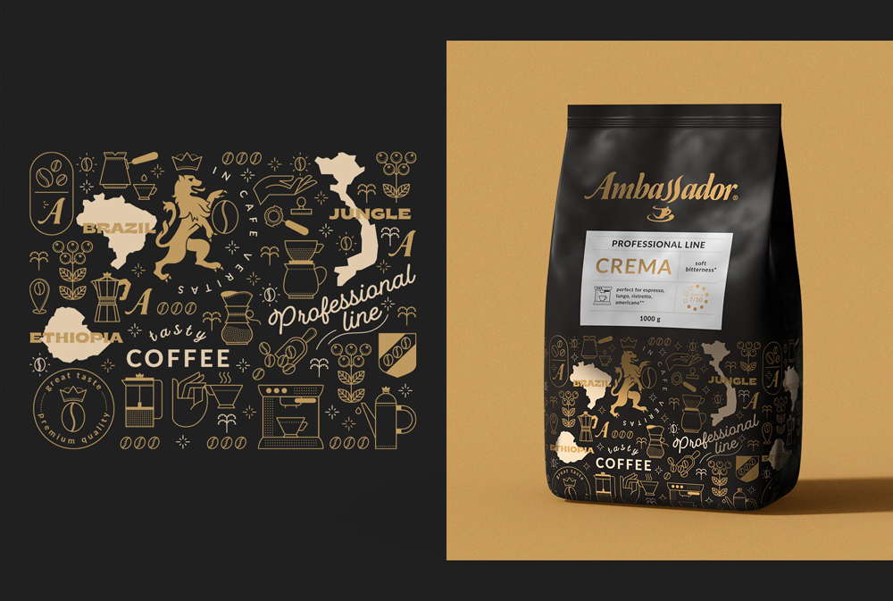 В паттерне бренда Ambassador Professional line собраны различные кофейные атрибуты: от обычных зёрен до причудливых кофейников из разных стран. В этот пёстрый орнамент деликатно вписаны атрибуты бренда: лев в короне, герб и фирменная литера А из логотипа. Силуэты стран рассказывают о происхождении напитка.