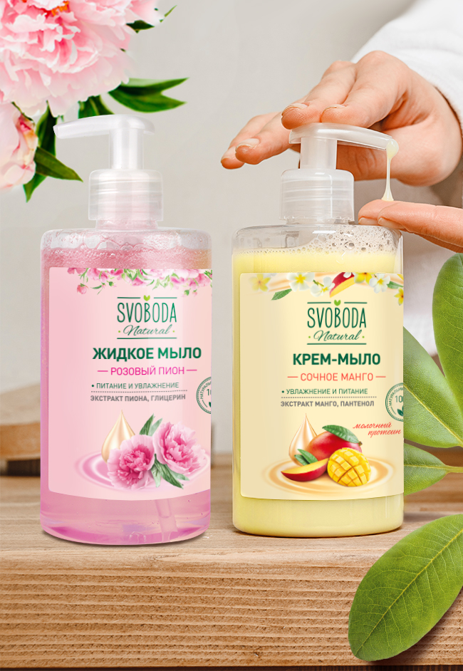В линейке Svoboda Natural появились целых две сочные новинки: крем-мыло Сочное манго и жидкое мыло Розовый Пион.