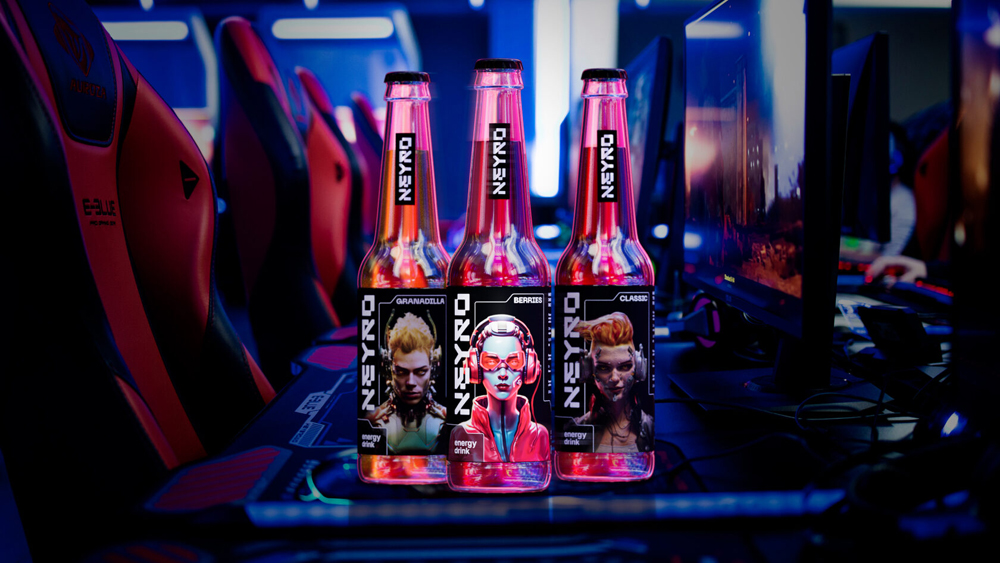 Логотип трансформируется в лаконичный фирменный знак — букву N, которую можно использовать на аватарках или бутылочных крышках. Для каждого вкуса сгенерировали персонажа в стиле киберпанк — так, чтобы цветовая гамма соответствовала вкусу напитка.