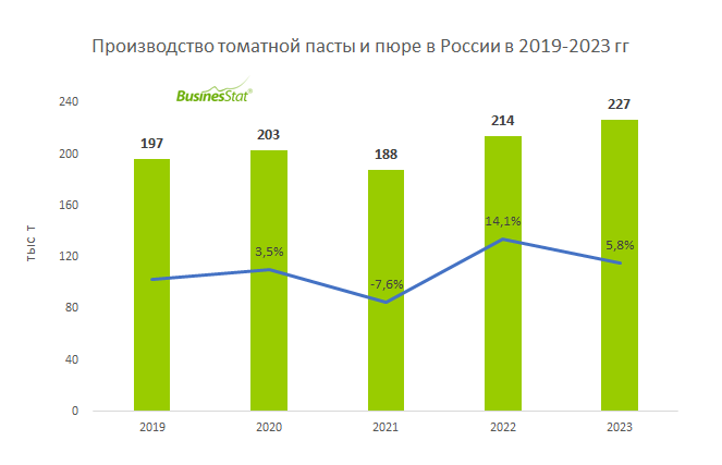 По данным , подготовленного BusinesStat в 2024 г, за 2019-2023 гг их производство в стране выросло на 15,4%: со 197 до 227 тыс т. Увеличение выпуска томатосодержащей продукции со стороны предприятий пищевой промышленности, рост популярности домашней кулинарии и здорового питания способствовали повышению спроса на томатный концентрат.