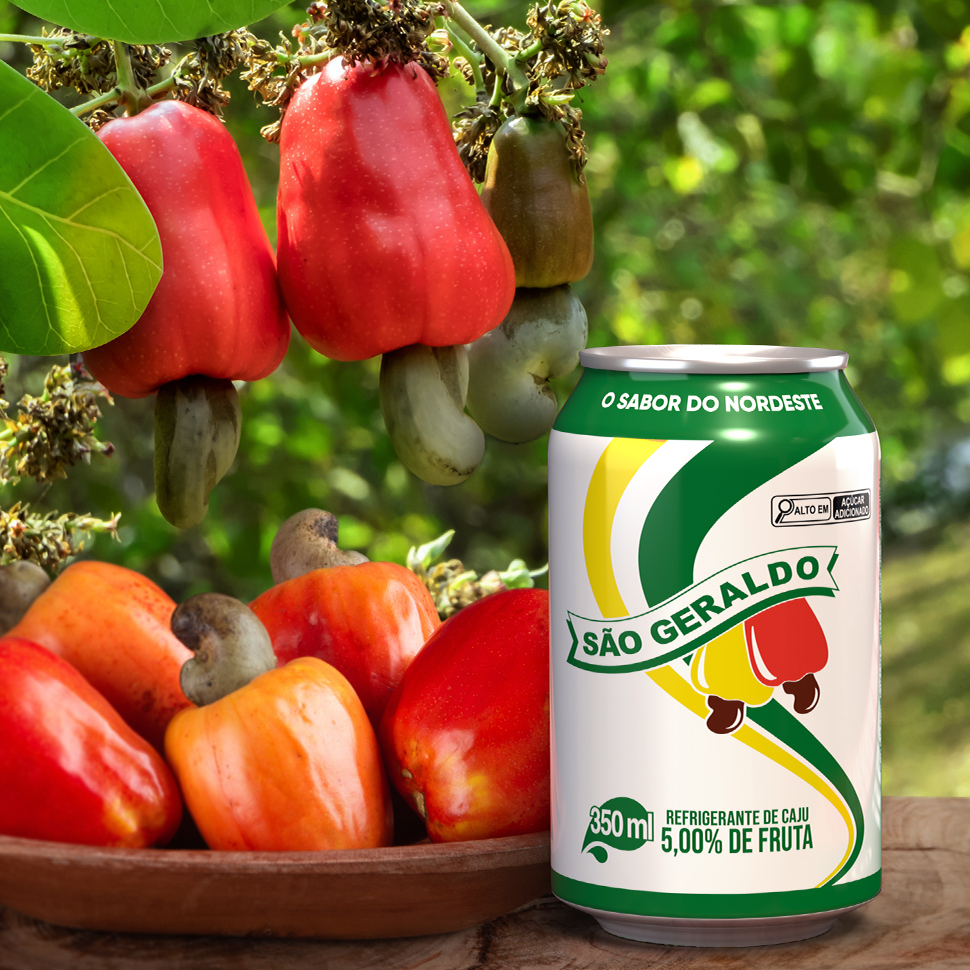 На новых красочных банках Cajuína São Geraldo изображены спелые плоды кешью аппетитного красного и золотисто-желтого цвета под баннером с надписью: «O Sabor do Nordeste» («Вкус северо-востока»). Этот слоган подчеркивает региональное происхождение продукта, а также его необычный освежающий вкус.