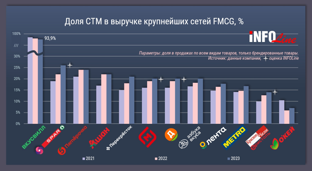 В 2024 году, по мнению экспертов INFOLine, стоит ждать ускорения роста продаж СТМ. Причиной тому станут стратегии лидеров (X5 Group и «Магнита»), а также быстрый рост жестких дискаунтеров.