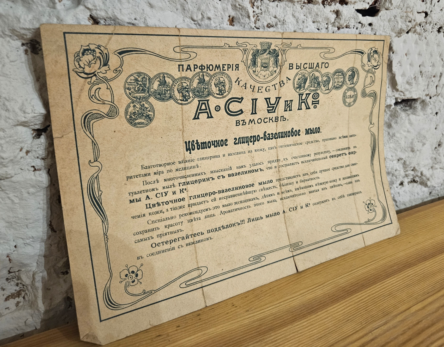 Она подарила Музею интересный артефакт – рекламную листовку товарищества Сиу (династия известных российских предпринимателей с французскими корнями), работавшего в конце XIX – начале ХХ вв. в кондитерской и парфюмерной промышленности России.
