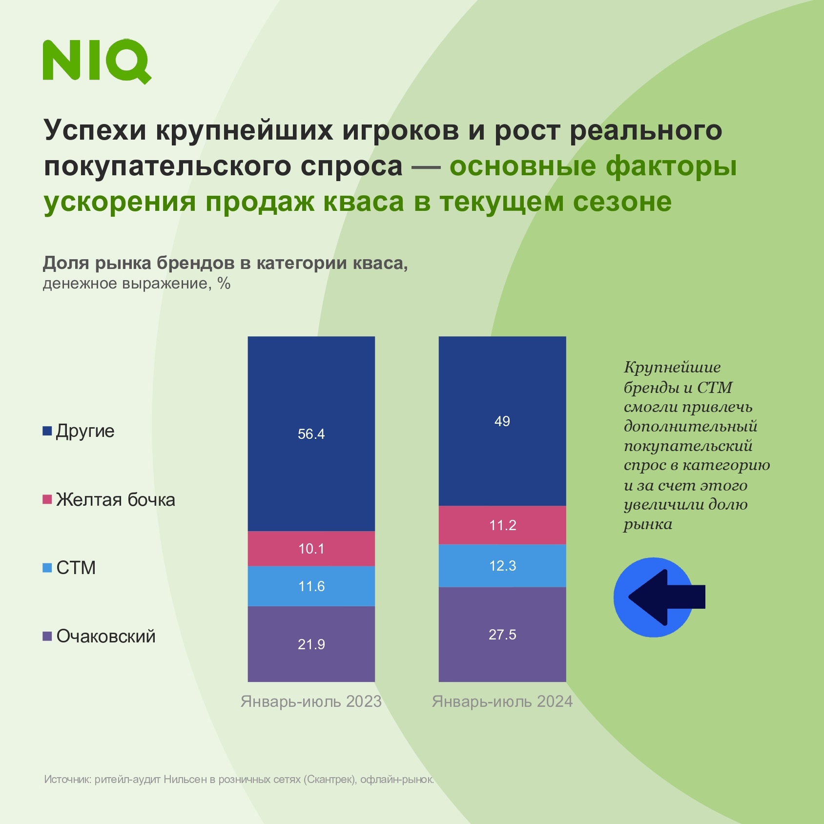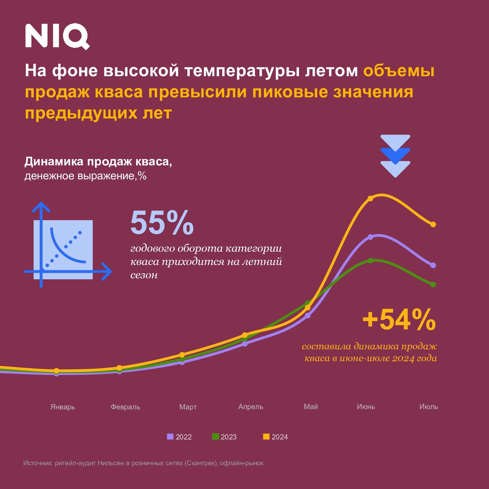Одна из самых ярких «летних» категорий, квас, продолжает устанавливать новые рекорды, сообщают аналитики NielsenIQ Россия. В июне-июле динамика ее продаж в денежном выражении составила +54%, а в натуральном — +36%, в абсолютных значениях превысив и 2023, и 2022 год.
