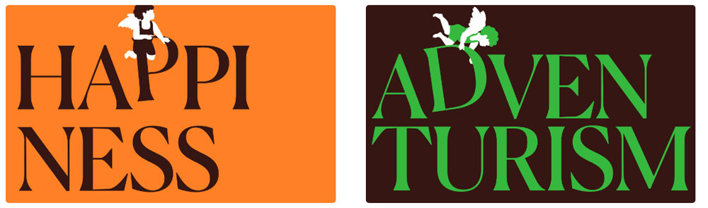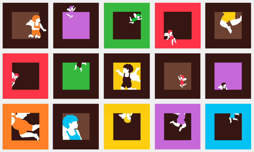 Фирменная гамма держится на вкусном сочетании цветов молочного и горького шоколада с дополняющими чистыми оттенками. Для иллюстраций используются эмоциональные слова, сложенные буквами, которыми играет фирменный персонаж-путти.