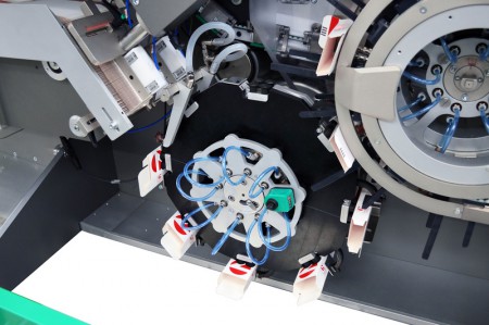 The GUK feeding unit is in an ergonomic position (lower than previous models) to ease leaflet loading. In view of the high processing speeds involved, a new rotating pick-and-place unit has been designed and installed to transfer the leaflets to the pushers.