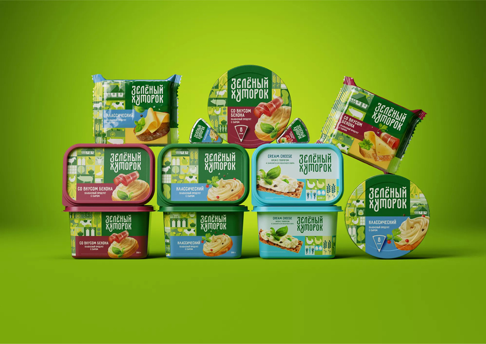 Команда commersart разработала дизайн упаковки для линейки сырной продукции "Зеленый хуторок" для компании "Сыробогатов". Необходимо было создать дизайн в сегменте low-cost, который будет вызывать ассоциации с натуральной домашней деревенской продукцией.