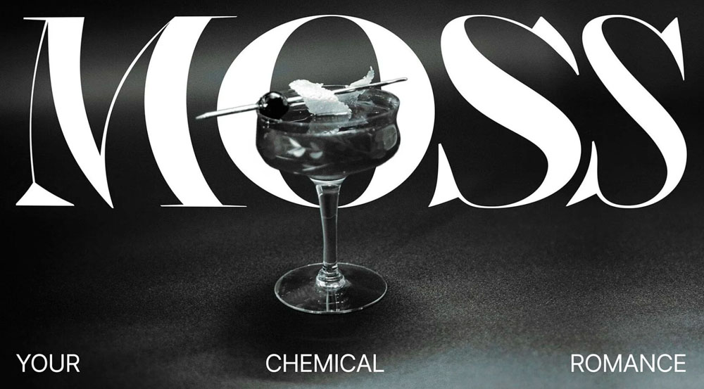 А дизайнеры Moloko позволили шрифту сказать все, что нужно. Именно он является стилеобразующим элементом всей айдентики. В надпись MOSS, выполненную изящной антиквой, заложена метафора измененного сознания и более объемного видения реальности вокруг. Пластика логотипа отсылает к состоянию легкого опьянения, буквы вытянуты, будто смотришь на них сквозь бокал-флюте.