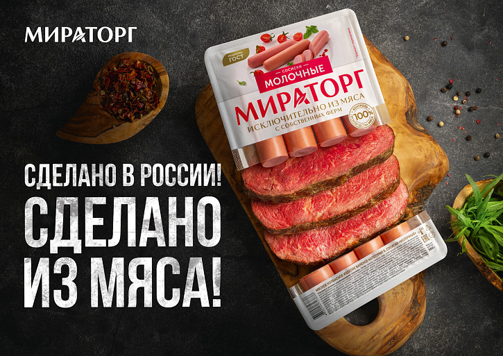 В обновленном дизайне «Мираторг» доносит до потребителя свое уникальное преимущество: это главная коммуникация на упаковке – «Исключительно из мяса с собственных ферм», а также новый слоган «Сделано из мяса! Сделано в России!», поскольку «Мираторг» самостоятельно производит именно в России все виды мяса (свинину, говядину и курицу), которые используются в производстве колбасных изделий.