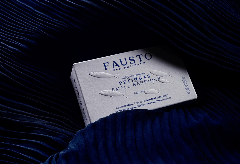 Португальская студия Volta представляет дизайн упаковки для премиального бренда консервированной рыбы Fausto Sea Artisans. В упаковке центральное место отведено рыбе. Она представлена белым тиснением, как скульптура на пьедестале.