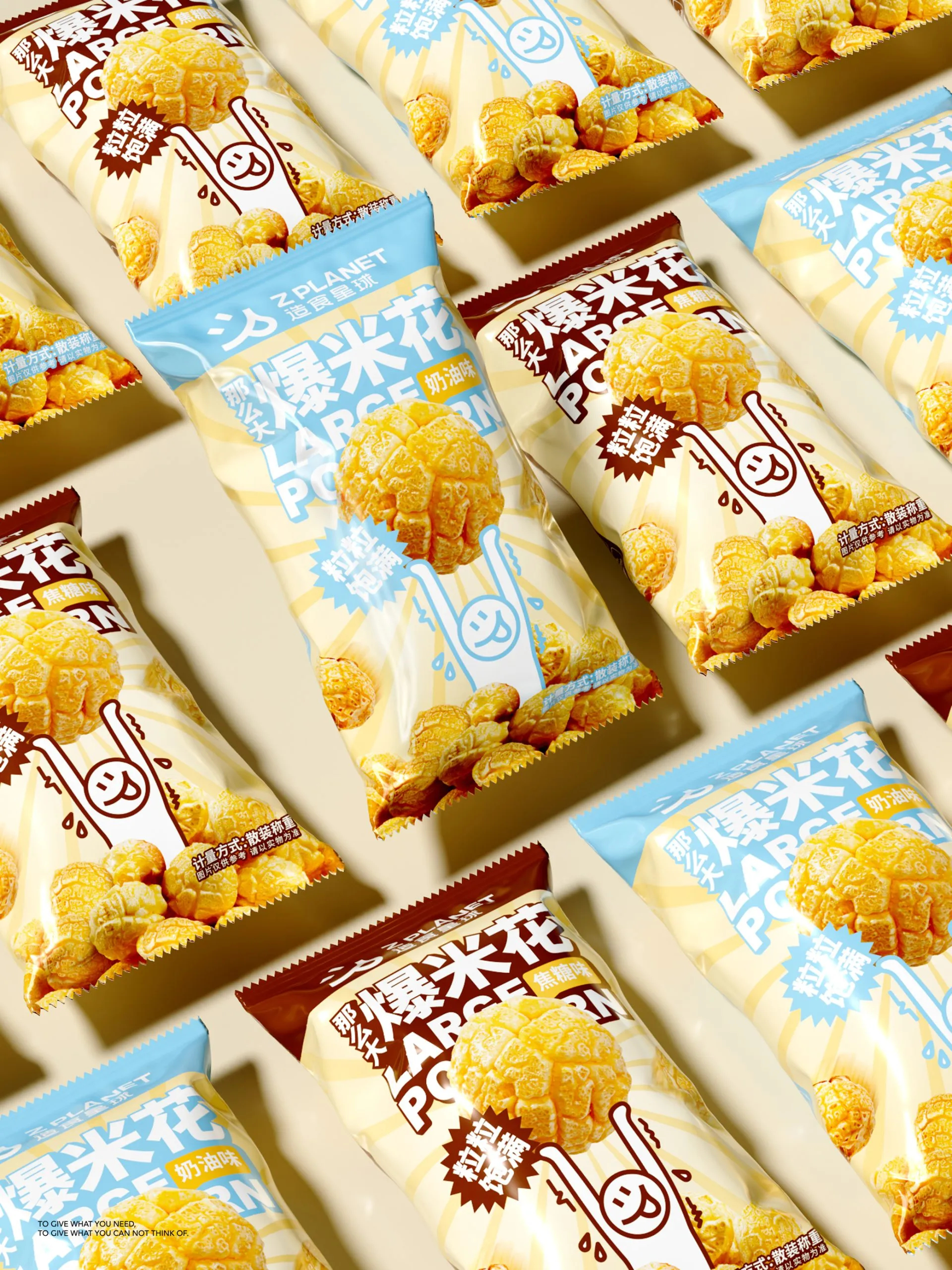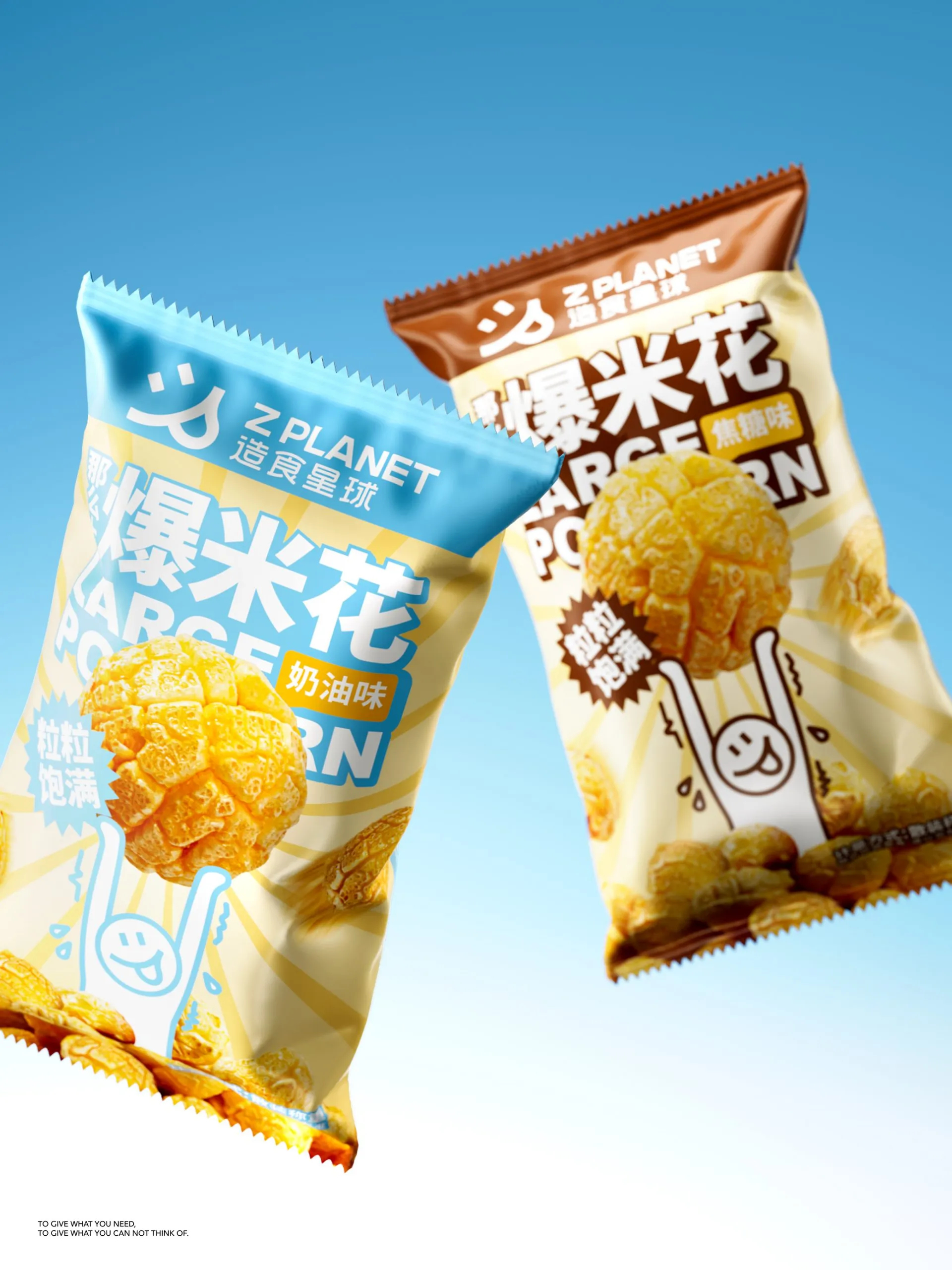 Создатели упаковки отмечают: «В этом дизайне попкорна мы переносим пункт продажи продукта на главную картинку и страницу с подробностями для конкретного объяснения на основе характеристик новой онлайн-розницы, оставляя больше места для интересных продуктов и творческого выражения. В то же время мы цитируем плоские и интересные наброски персонажей и размещаем реальные снимки продукта в масштабе 1:1, чтобы подчеркнуть характеристики каждого зерна попкорна, создать визуальный центр тяжести и мощную атмосферу аппетита и стимулировать мотивацию к покупке.