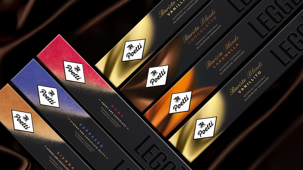 Важно было не просто связать дизайн капсул с дизайном Poetti Leggenda в натуральном кофе, а передать в графике ощущение изысканного удовольствия от потребления кофе. Необходимо было создать лаконичный и эстетичный дизайн, который бы выделялся на полке, сохраняя премиальность и обеспечивая четкую дифференциацию ассортимента.