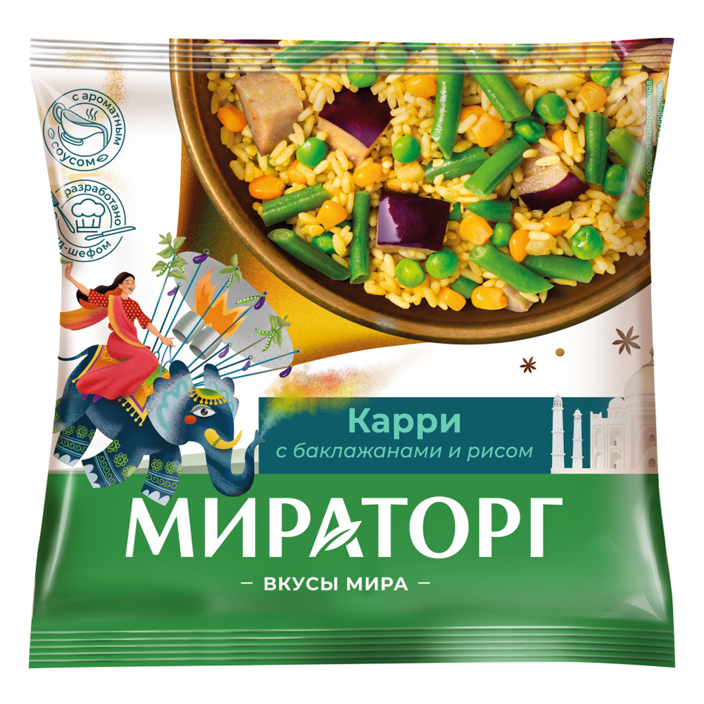 В линейку вошли: индийское карри с баклажанами и рисом — нежный рис с хрустящей зеленой фасолью и горошком в остром соусе карри;