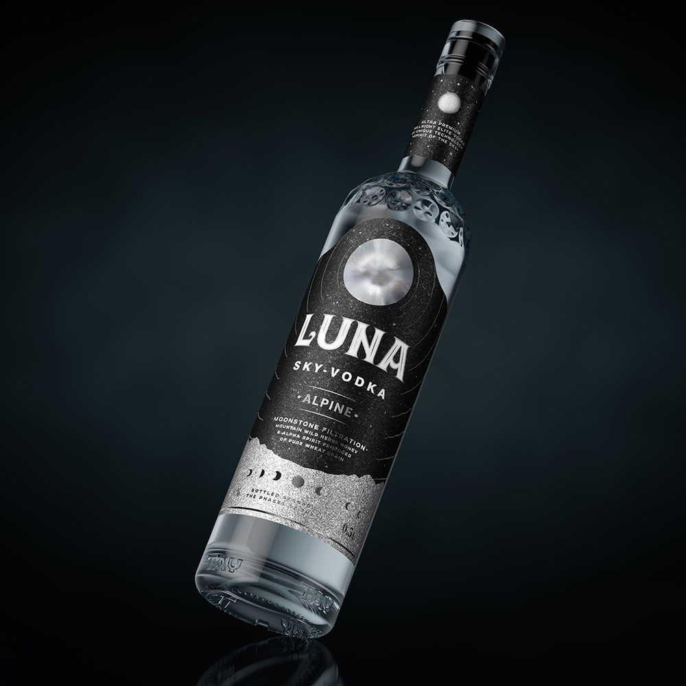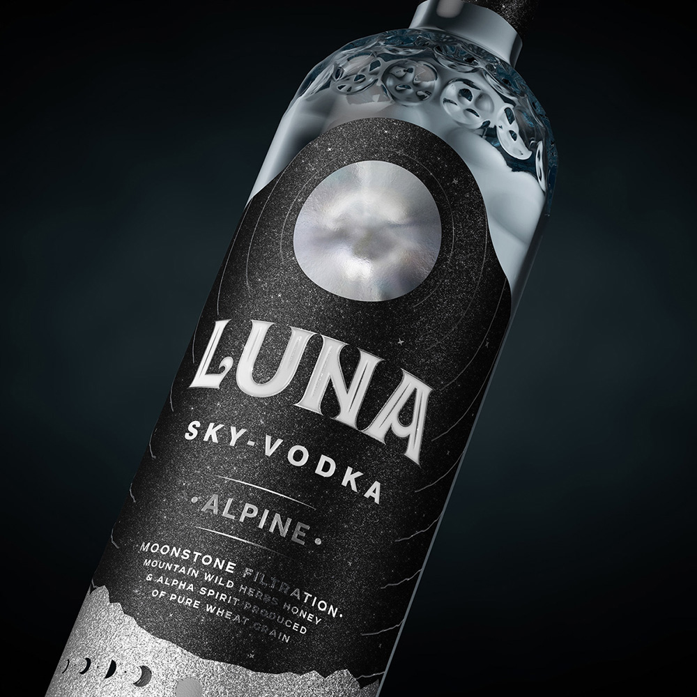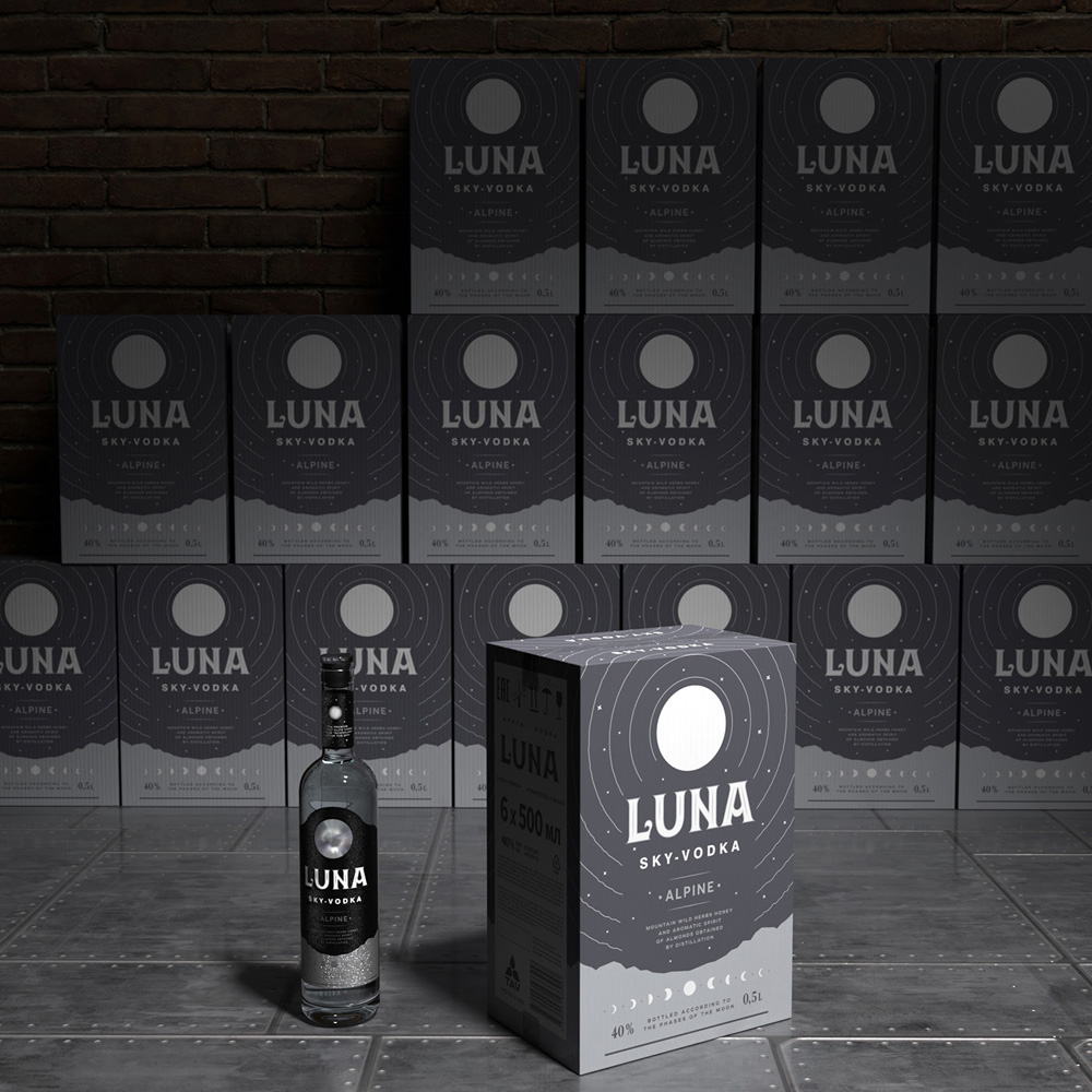 Короткое название LUNA воплощает суть позиционирования. Эти символ и слово понятны всем на разных языках. Многие верят в ее влияние на психологическое и даже физиологическое состояние людей. Название поддерживает определение SKY VODKA. Позиционирование подкреплено двумя УТП: эмоциональным – водка изготавливается в соответствии с фазами луны, и рациональным – она проходит очистку лунным камнем. Использованы различные современные технологии – от Deep Lens Френеля, с эффектом объемной переливающейся Луны, до свечения отдельных элементов в ультрафиолете.