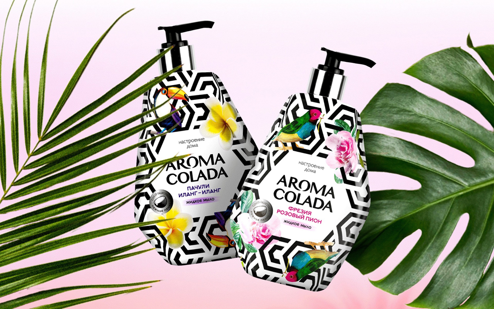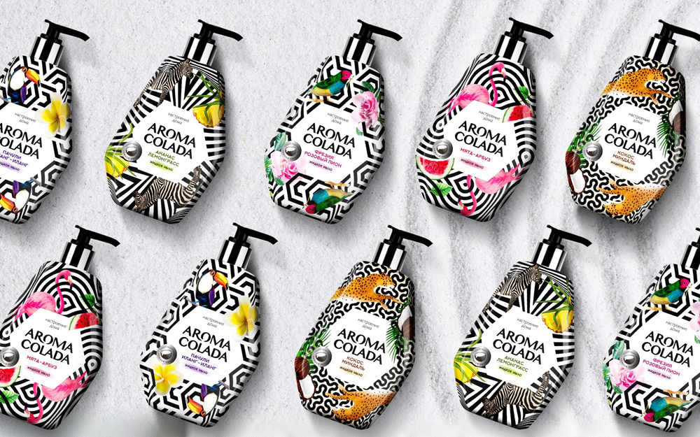 Компания "Адрия и К" обратилась в агентство Getbrand с задачей создать запоминающийся и выделяющийся дизайн упаковки для линейки жидкого мыла Aroma Colada.