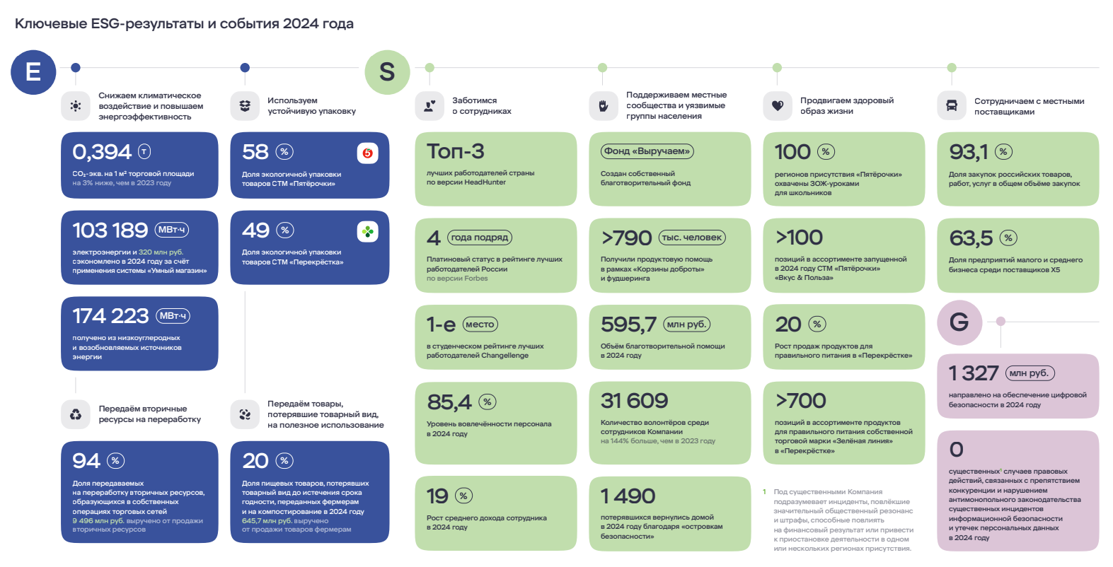 Впервые в отчете сделана финансовая оценка вклада Х5 в достижение Национальных целей РФ. Так, в 2024 году более 500 млрд руб. было направлено на закупку товаров, работ, услуг у российских субъектов малого и среднего предпринимательства (цель «Устойчивая и динамичная экономика), более 100 млрд руб. – на программы поддержки семьи и родительства (цель «Сохранение населения, укрепление здоровья и повышение благополучия людей, поддержка семьи»), более 22 млрд рублей — затраты X5 на проекты по разработке и внедрению российских ИТ-решений (цель «Цифровая трансформация государственного и муниципального управления, экономики и социальной сферы»).
