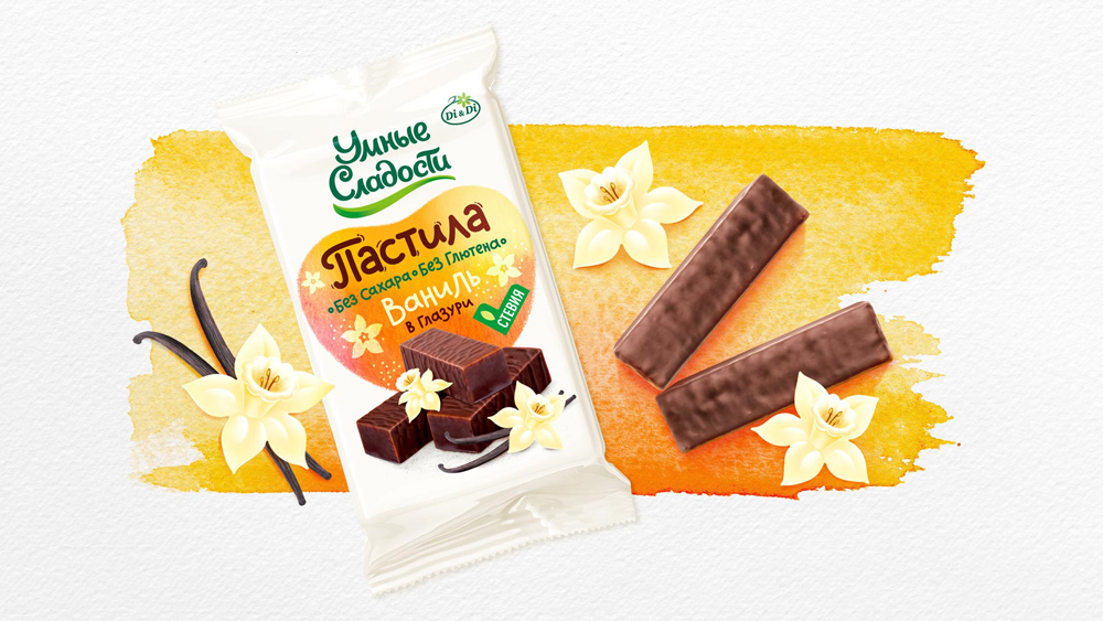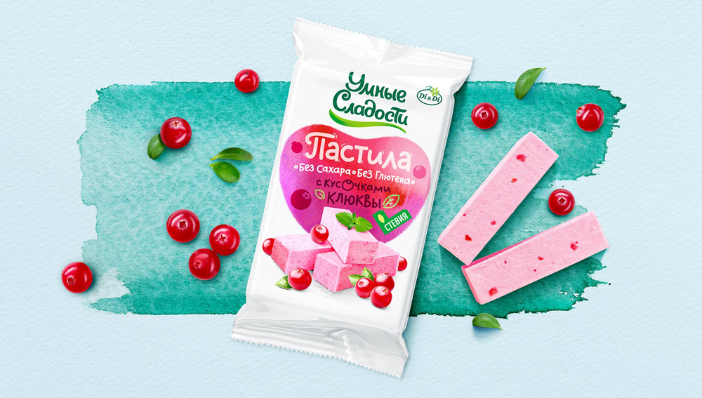 Брендинговое агентство Profsoyuz разработало дизайн упаковки для пастилы без сахара "Умные сладости". Продукт ориентирован на людей с диабетом и тех, кто выбирает продукты без сахара и глютена. При этом важно было сохранить стилистическое единство с основной линией бренда — светлый фон с яркими акцентами. И создать яркий, привлекающего внимание дизайна, который также четко доносил бы основные свойства продукта, такие как отсутствие сахара и глютена.