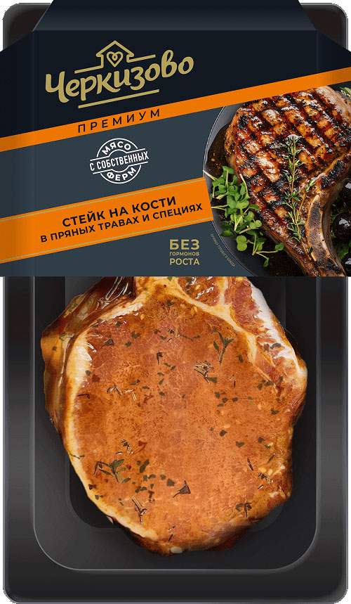 Вторая новинка в соусе — стейк «Черкизово Премиум» из свиной корейки с косточкой. Толщина продукта составляет около 2,5 см. Он содержит тонкий слой шпика по краю, что обеспечивает хорошую прожарку блюду и сохраняет необходимую сочность мяса.