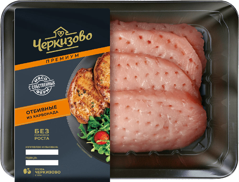 Третий продукт — свиные отбивные из карбонада — не содержит готового маринада и открывает простор для фантазии покупателей. Это уникальный продукт на рынке полуфабрикатов из свинины, так как обычно отбивные из карбонада продаются только в кулинарии. В упаковку входит несколько аппетитных стейков, предварительная подготовка которых на производстве делает мясо мягким и нежным на вкус.