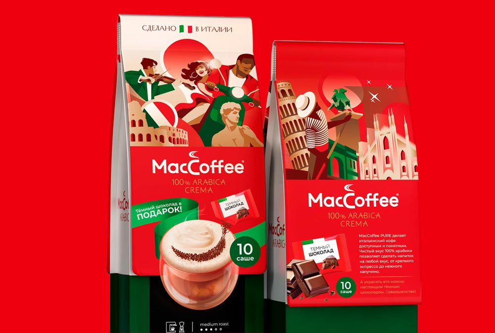 Дизайнеры постарались передать атмосферу Италии. Яркий вкус арабики раскрывает всю палитру ассоциаций, связанных с этой страной: звуки, ароматы, впечатления, эмоции — всё это складывается в пёструю мозаику образов, лёгших в основу дизайна промо-упаковки. Использование фирменных оттенков MacCoffee в сочетании с контрастным травянисто-зелёным цветом создают деликатную отсылку к колористике итальянского флага.