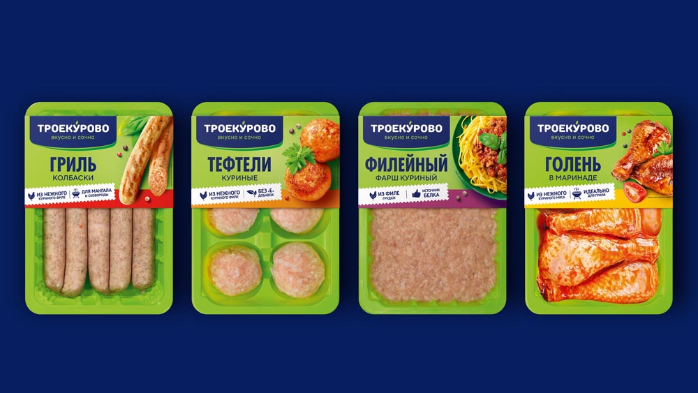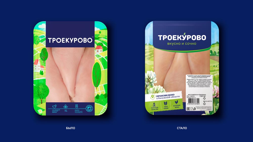 Брендинговое агентство Getbrand провело ребрендинг для производителя куриной продукции "Троекурово". Было необходимо повысить узнаваемость бренда, при этом сохранив преемственность и узнаваемость текущего дизайна упаковки. Важной целью было перевести восприятие бренда в сознании потребителей из образа федерального технологичного производителя в более локальный и близкий к людям.