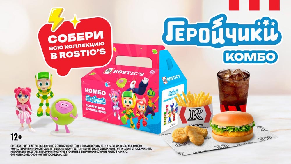 В сети ресторанов быстрого обслуживания ROSTIC’S появилось новое комбо с персонажами мультсериала "Геройчики". В коллекцию игрушек вошли 8 полюбившихся зрителям героев, среди которых Флай, Пинки, Бублик, О-Раш, Генерал Де Кролль, Ко-ко, Глория и Кошка-Точилка. Новинка будет доступна для заказа в ресторанах сети до 1 сентября 2025 года.