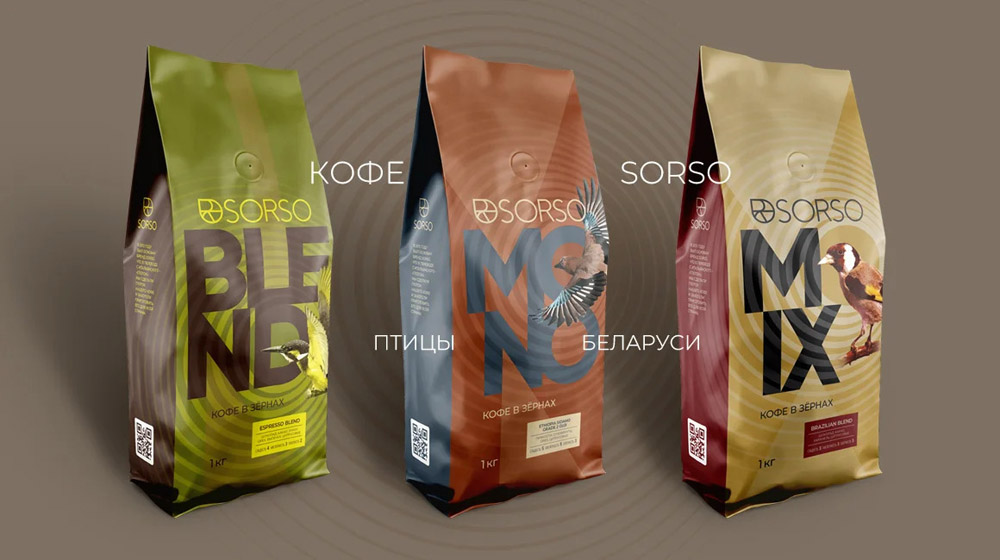 Так как полный цикл производства SORSO осуществляется в Беларуси, то долго выбирать уголок планеты для путешествия не пришлось. Считается, что птица – символ души. Компания SORSO полностью вкладывается в реализацию своего проекта, для них кофе – не просто напиток, а настоящая жизнь, вот так и было определено выбрать под каждый вид кофе свою уникальную «душу»: зимородок, сойка и щегол черноголовый. Природные цвета и оттенки придают ощущение натуральности.