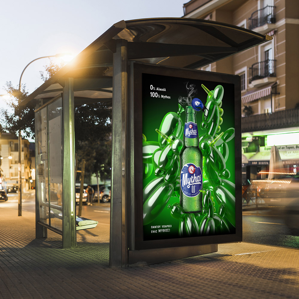 В дизайне Mythos 0.0 соблюден баланс между кодами пивной категории, узнаваемостью бренда и самобытностью. Благодаря элементам, подчеркивающим его безалкогольный характер, оно отличается особой индивидуальностью. Синий цвет соответствует отраслевым стандартам для безалкогольных напитков. А чтобы подчеркнуть безалкогольный характер, дизайнеры создали мир, который излучает позитивную энергию. И в этом им помогают единороги из воздушных шаров.