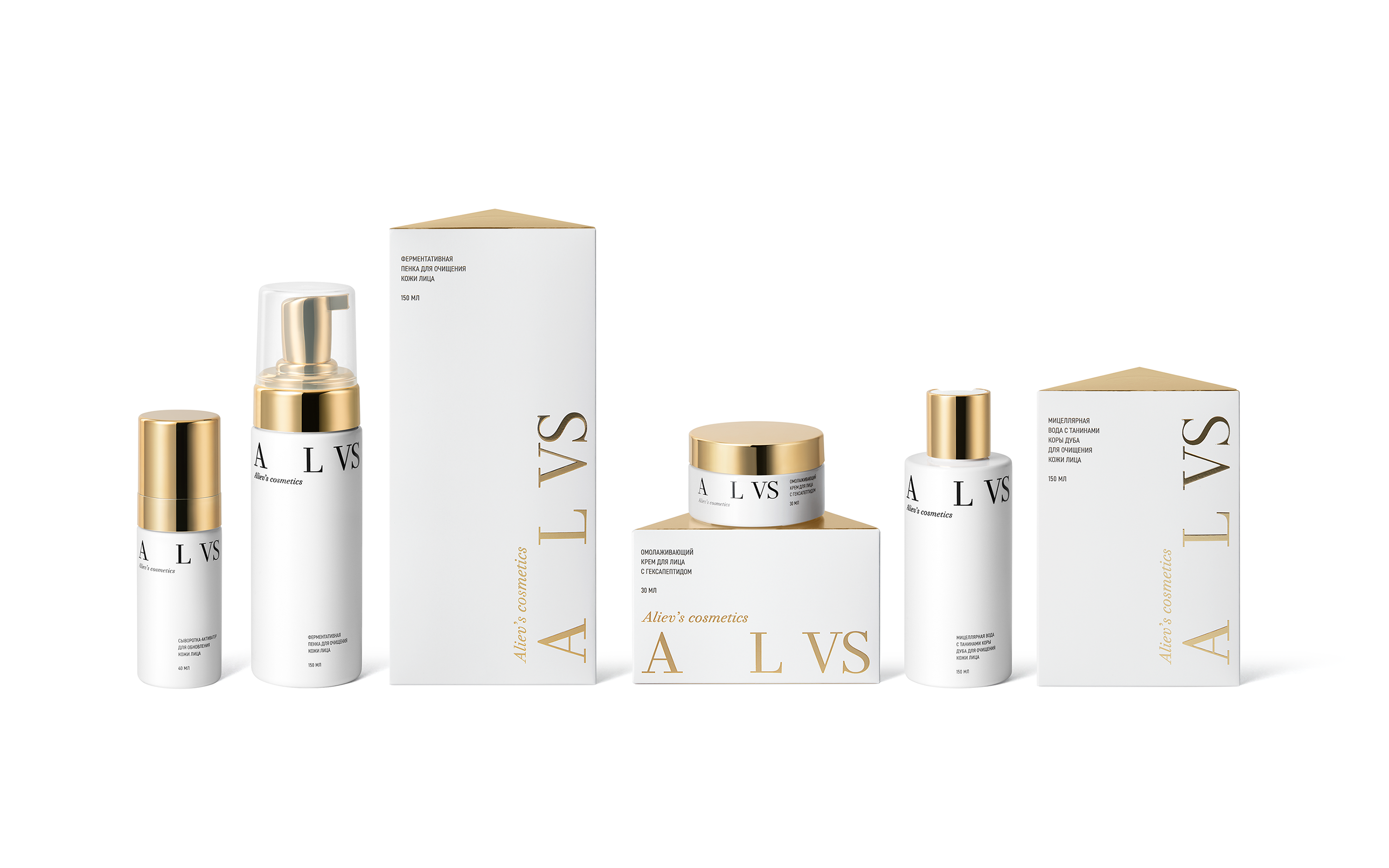 Типографический логотип ALVS содержит буквы, взятые из уже существовавшего названия Aliev’s, которое изначально использовалось как личный бренд доктора и играло определяющую роль при выборе хирурга. Имя доктора сохранилось и в вербальной основе бренда косметики, став частью дескриптора Aliev’s cosmetics.