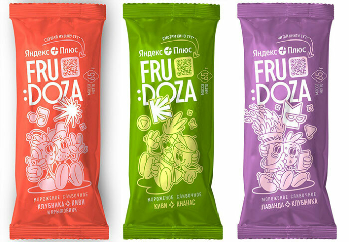 Всего выпущено три вида мороженого: со вкусом лаванды и клубники, киви и ананаса, клубники, киви и крыжовника. Миксы уникальны и ранее не выпускались. Все три новинки мороженого Frudoza получили яркие упаковки с эксклюзивным QR-кодом. Отсканировав его, можно подключить на 60 дней подписку Яндекс Плюс, куда входят Кинопоиск, Яндекс Музыка и Яндекс Книги.