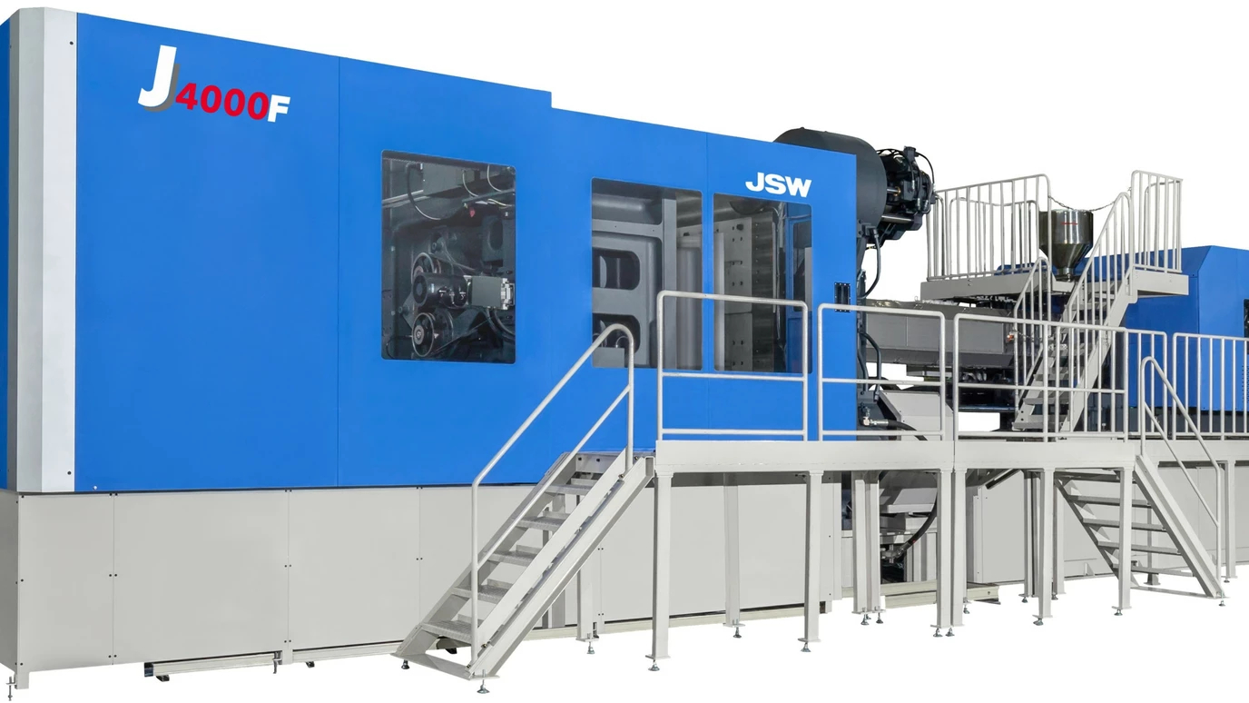 Компания JSW теперь предлагает полностью электрическую двухплитную литьевую машину с усилием смыкания 40 000 кН в стандартной комплектации, однако она не будет представлена в Дюссельдорфе. Максимальный объём впрыска этой машины составляет 22000 см³, что соответствует примерно 18,6 кг полипропилена (ПП). Типичные области применения включают детали внешней отделки автомобилей, такие как бамперы и задние борта, а также корпуса аккумуляторных батарей для электромобилей. Длина этой большой машины составляет 17,4 м. Это меньше, чем у большинства аналогичных гидравлических машин на рынке.