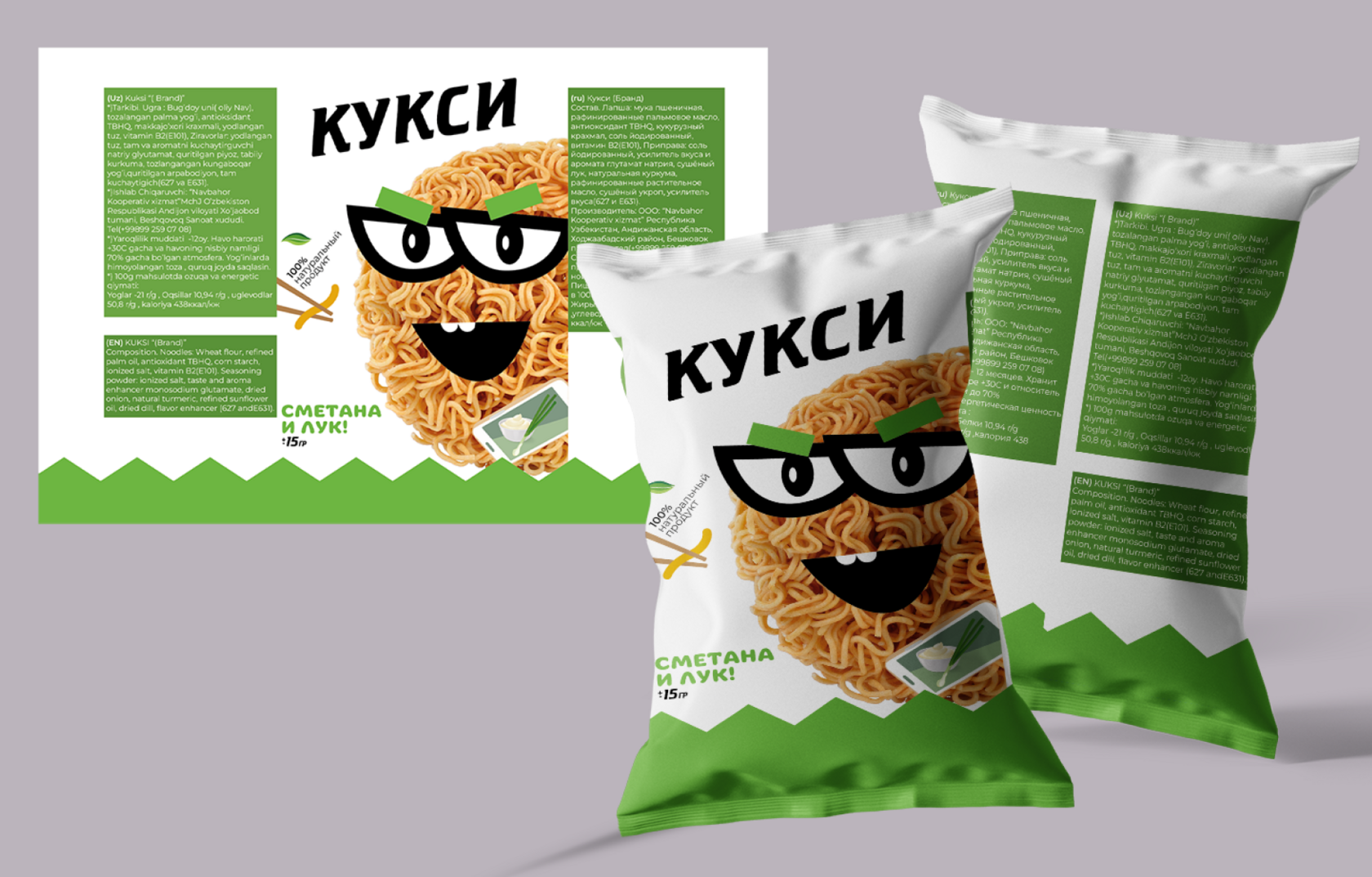 Цветовая палитра строилась вокруг вкусов: сыр, шашлык, острый, сметана с луком. Цвета выбраны не случайно — они привлекают взгляд на полке и играют на эмоциях (зеленый — свежесть, красный — энергия). Зеленая кайма зигзагом внизу всех упаковок объединяет линейку, напоминая горные узоры Узбекистана или волны лапши. Шрифты тоже важны: логотип — жирный и современный, с кириллицей и латиницей для широкой аудитории. Дополнительный текст — четкий и читаемый, даже на маленьких пачках.