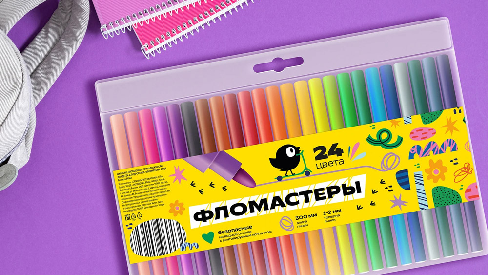 Принадлежность к бренду подчёркивает фирменный желтый цвет на фоне, а также присутствие маскота «Чижика». Яркий дизайн захватывает внимание школьников и их родителей и делает рутинный процесс покупки интереснее и привлекательнее.
