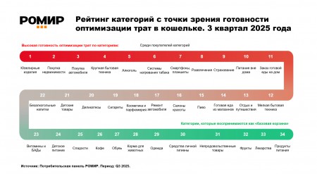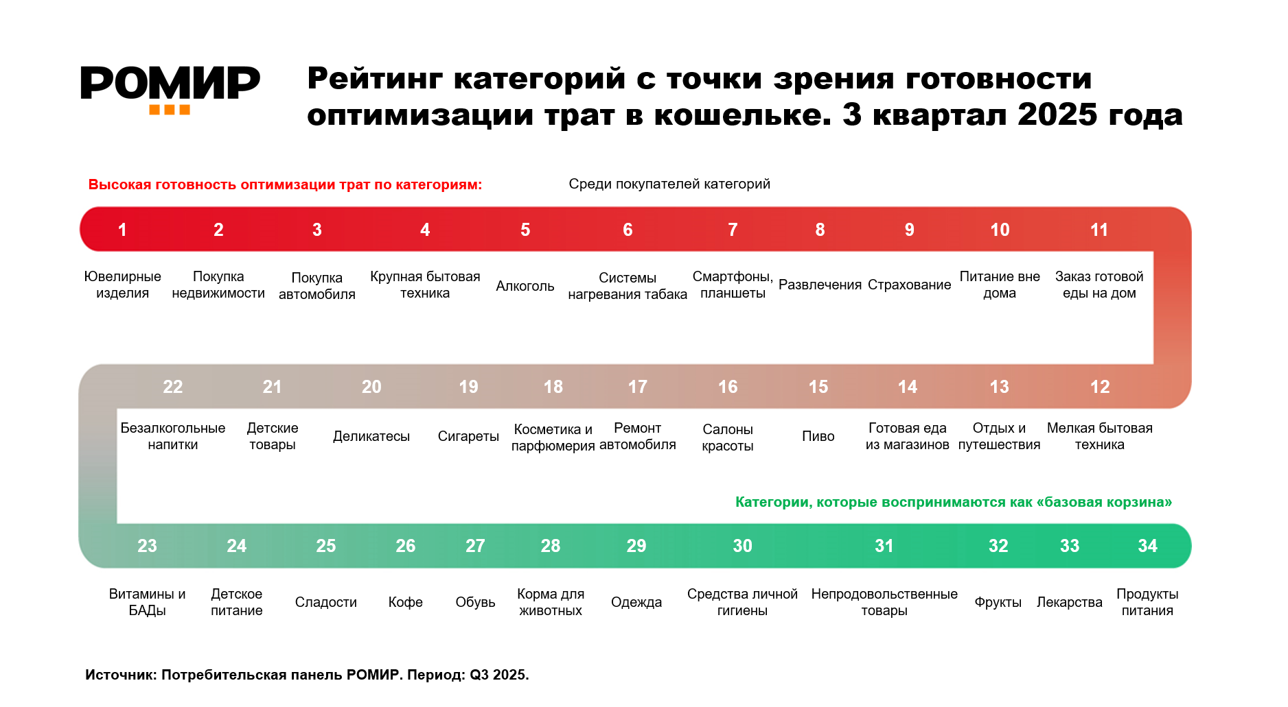 Исследование РОМИР за третий квартал 2025 года показало, что россияне готовы отказаться или отложить на неопределенный срок покупку ювелирных изделий, недвижимости, автомобиля и крупной бытовой техники. Также оптимизируются траты на алкоголь, системы нагревания табака, смартфоны и планшеты. Кроме того, режим экономии распространился на развлечения, страхование, питание вне дома и заказ готовой еды на дом.