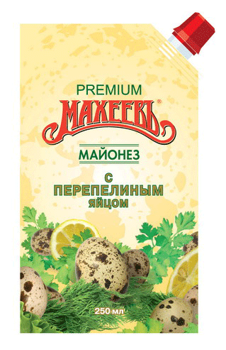 Дизайн упаковки выгодно выделяет новинку на полке и в то же время выполнен в общем стиле упаковок Дой-пак ТМ "Махеевъ". Потребитель легко сможет отличить упаковку майонеза "С перепелиным яйцом" ТМ "Махеевъ" благодаря яркости красок, выделяющемуся логотипу, узнаваемым лимонам и зелени.
