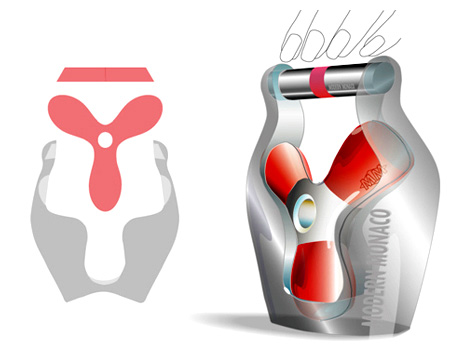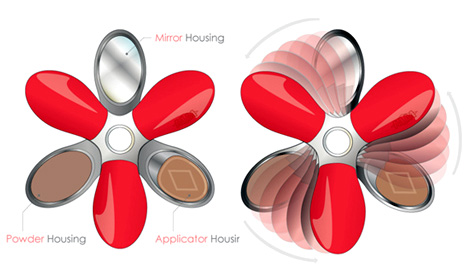 Однако это еще не все. Дизайнер также разработал специальных футляр, который состоит из друх отделений. Одно из них предназначено для пудры с зеркалом, другое же – для губной помады, которая служит также ручкой для переноски всего контейнера.