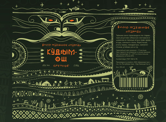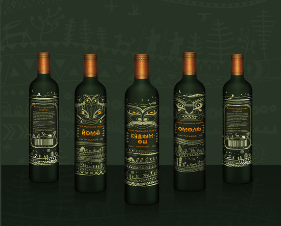 У каждого вина – своей персонаж: Кудым-Ош, Йома и Омоль, крупным планом изображенный на этикетке. Кроме него, вся поверхность заполнена миниатюрными охотниками, птицами, зверями и тд. Даже штрих-код не остался в стороне, из него произрастает некая северная флора.