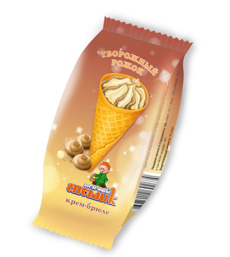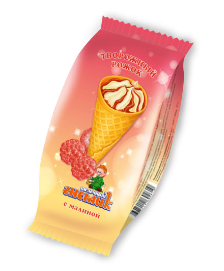 Марка "Молочный гномик" предназначена, в первую очередь, для детей, поэтому перед дизайнерами стояла задача создать яркую, привлекающую детское внимание упаковку. Дизайнерским решением стало изображение рожка, у основания которого расположен продукт-начинка. Также рядом помещен логотип марки "Молочный гномик". Использованные шрифты соответствуют общему стилю продуктов марки.