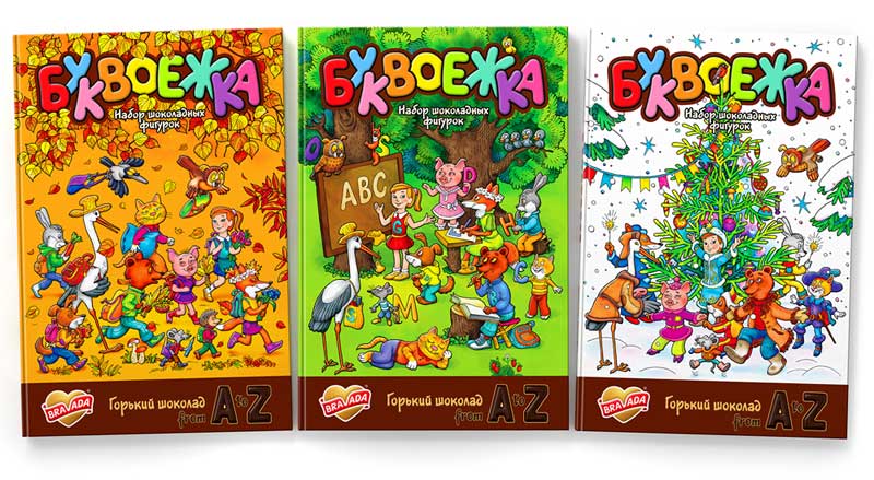 Серия из шести упаковок условно разделена на две группы: горький и молочный шоколад. В каждой группе три вида обложек: «Лесная школа», «Первое сентября» и «Новый год». На оборотной стороне каждой из них 4-5 букв с четверостишием и иллюстрациями.