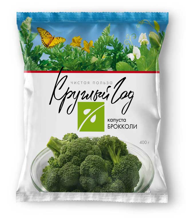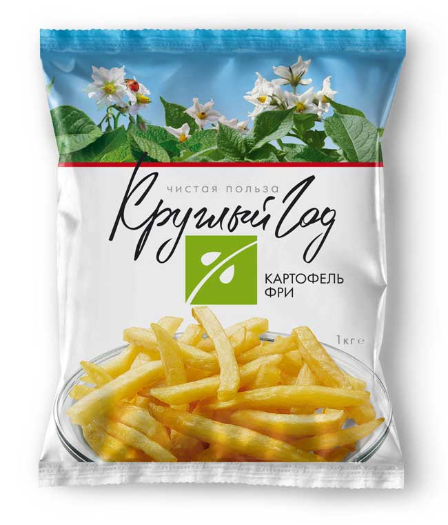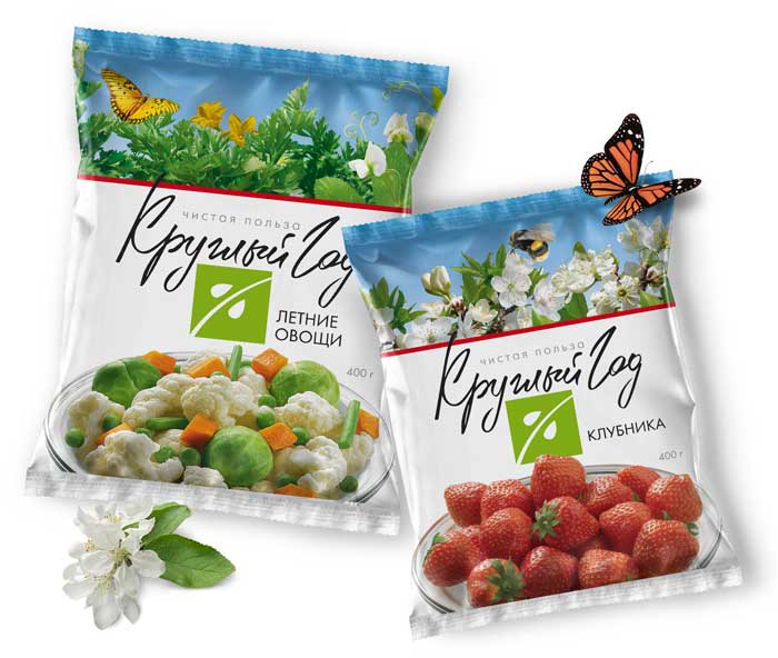 Сегодня продукция под торговой маркой «Круглый Год» получила концептуальный дизайн, коммуницирующий лёгкость, натуральность, полезность продукции, а также внятную архитектуру марки – разнесение продукции на группы «овощи», «фрукты», «картофель-фри» за счёт смены сюжета цветного топера. Для своего рынка дизайн является свежим, позволяет выделиться на фоне конкурентов и хорошо запомниться.
