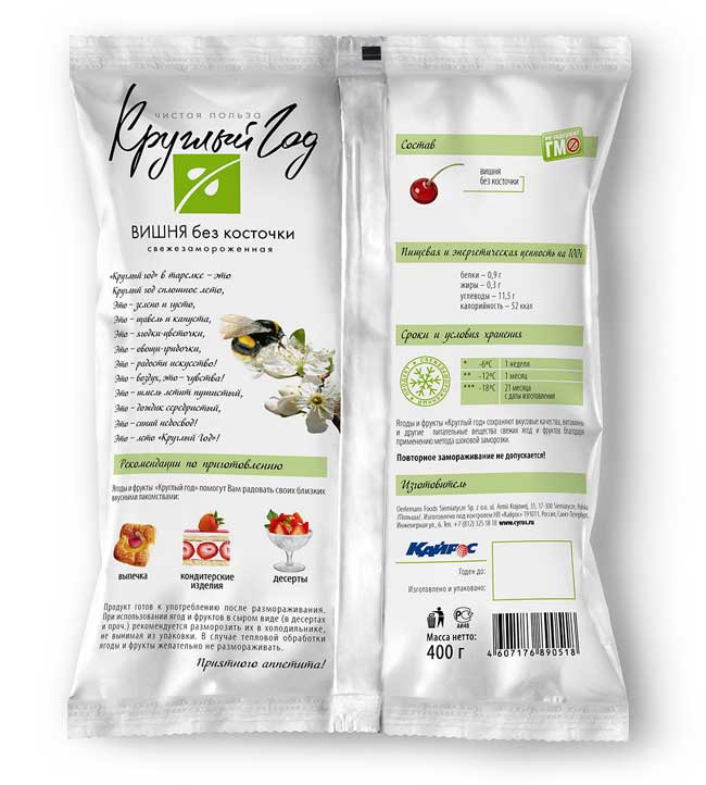Компания «Внешний Вид» разработала дизайн упаковки для Санкт-Пертербургской компании «Кайрос». Ранее производитель уже делал попытки вывести торговую марку «Круглый Год» на рынок, не уделяя при этом должного внимания брендингу. Продукция продавалась в нижнем ценовом диапазоне.